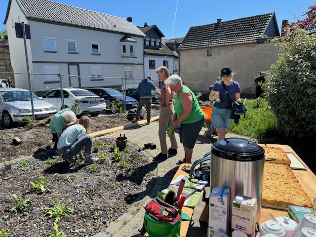 Ob jung oder alt – alle griffen zu Schaufeln und Gießkanne und brachten die Pflanzen mit vereinten Kräften in die Erde. Dabei kam auch das Miteinander nicht zu kurz: Bei strahlendem Sonnenschein, erfrischenden Getränken und leckerem Kuchen herrschte eine fröhliche und motivierende Atmosphäre.