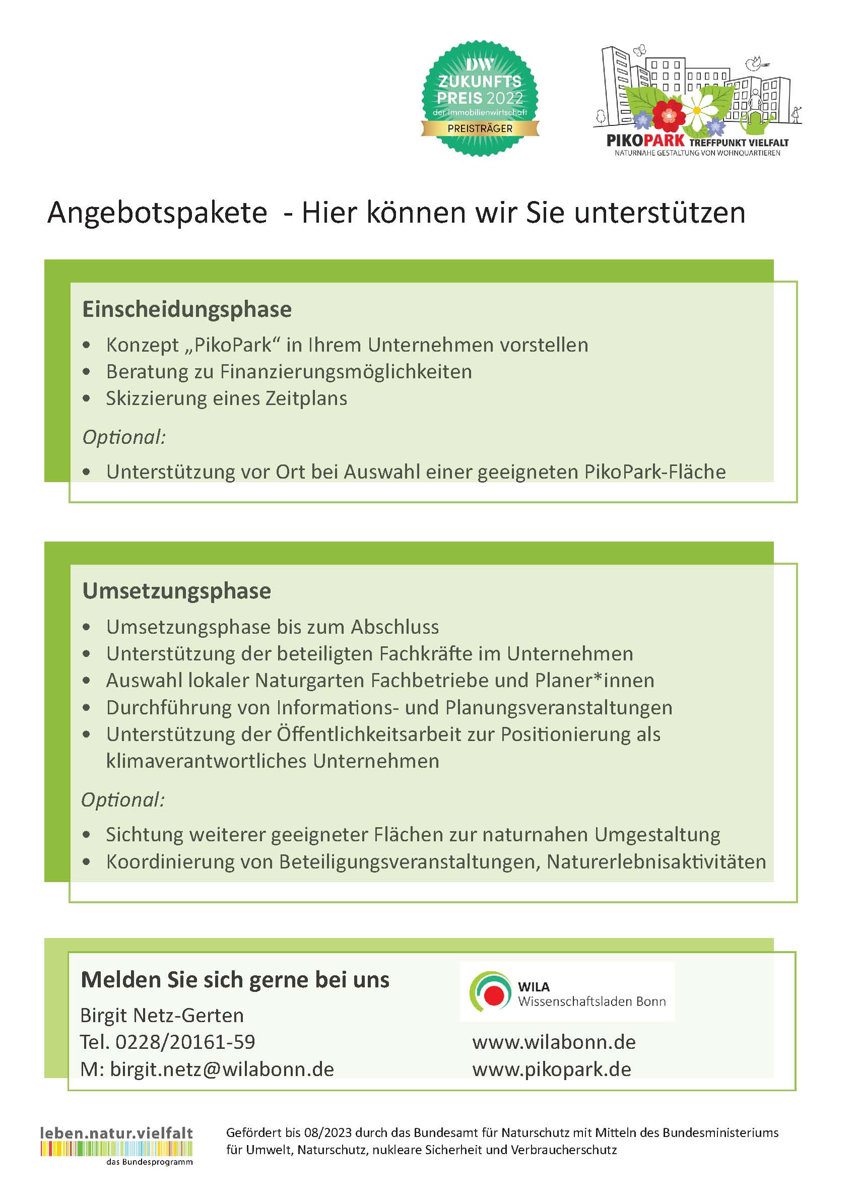 Diese besonderen Werte eines PikoParks werden auch auf der politischen Ebene als eine mögliche Antwort auf die gesellschaftlichen Herausforderungen erkannt. „PikoParks" werden in bundesweiten Förderprogrammen explizit erwähnt und bieten sowohl Unternehmen als auch Kommunen eine attraktive finanzielle Unterstützung für die Umsetzung. Und wir stehen bereit, Unternehmen und Kommunen auf diesem Weg zu begleiten. Wir beraten und begleiten Unternehmen und Kommunen auf diesem Weg – von der Entscheidung bis zur Eröffnungsfeier.
