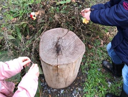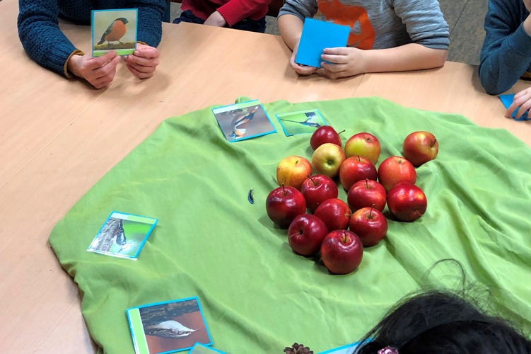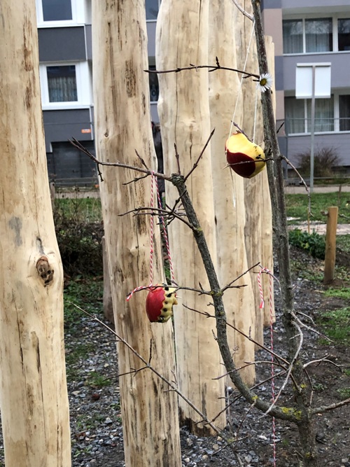 Die Kinder hatten die Plätzchen aus halbierten Äpfeln ausgestochen und mit unterschiedlichen Körnern und Nüssen bestückt, dann mit Zahnstochern durchstochen und eine Kordel daran befestigt. Fertig waren die Plätzchen und wurden an die Sträucher und Bäume im PikoPark gehängt.