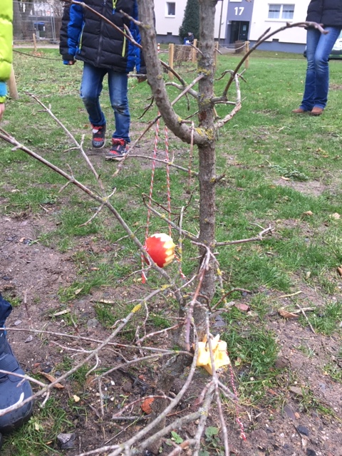 13 Kinder der OGS Westerfilde bastelten an ihrem vorletzten Schultag Plätzchen für die Vögel und hängten sie im PikoPark auf. Viele der Kinder wohnen direkt an der Fläche oder besuchen dort regelmäßig Freunde oder die Oma... So können sie in den nächsten Tagen und Wochen beobachten, welche Vögel sich die Körner aus den Äpfeln picken.