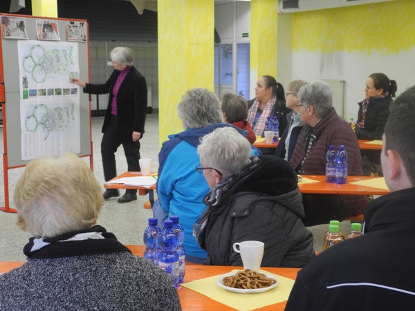 Im Herbst vergangenen Jahres haben die Mieterinnen und Mieter der GEWAG und Bewohner vom Hasenberg sich kreativ überlegt, was sie wie an Natur in einem PikoPark erleben möchten. Ulrike Aufderheide hat diese Ideen aufgegriffen und in einen Gestaltungsplan einfließen lassen. Anhand des Plans zeigte sie, wie die Ideen umgesetzt werden und welchen Nutzen die einzelnen Elemente für Natur und Tiere haben. Die Anwesenden freuten sich, dass alle ihre Ideen aus dem Workshop im Herbst in dem Plan aufgenommen wurden und erkannten, wie viel so ein kleiner Park für Mensch und Tiere bedeuten kann. "Wo könnten denn Igel in dem Park Unterschlupf finden?" fragte eine Mieterin der GEWAG. Auch wenn dazu nichts konkret im Plan vorgesehen ist, so wird der Park sich nach Fertigstellung weiter entwickeln und dem Bau eines Igel-Häuschens steht nichts im Weg.